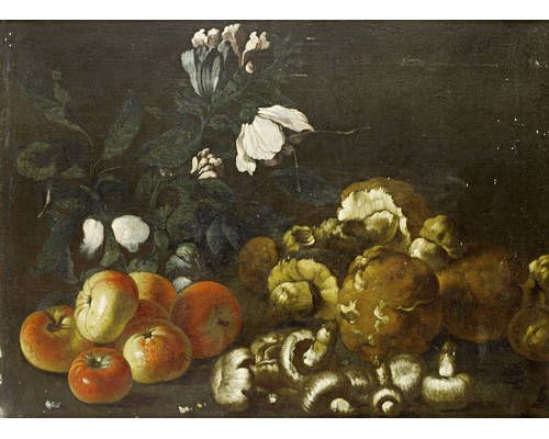 | A still life of apples, mushrooms and flowers | |