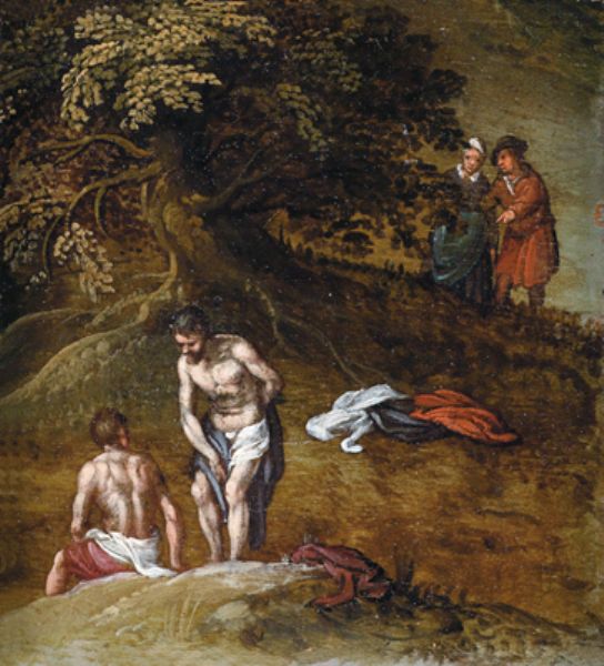 | Two men bathing while being observed by a couple / Paesistico con due bagnanti spiati da una coppia sullo sfondo | |