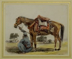 Soldier with a horse with a camel sheltering beneath a tree beyond