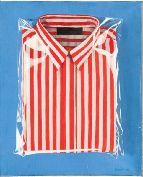 Opakowana koszula w paski na niebieskim tle. Wersja II