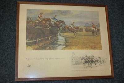 Horse racing scene with jockeys at the jump, 'A sight to take home and dream about'