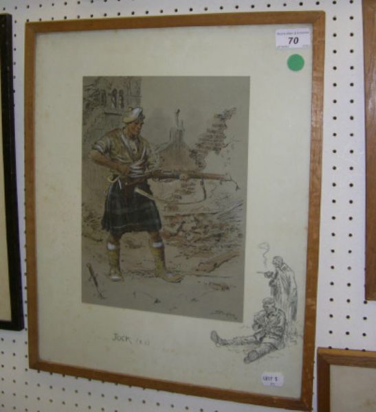 | Jock (K.I.)", a World War I scene depicting a highland soldier, chromolithograph, bears studio snaffle bit stamp and gallery lab | |