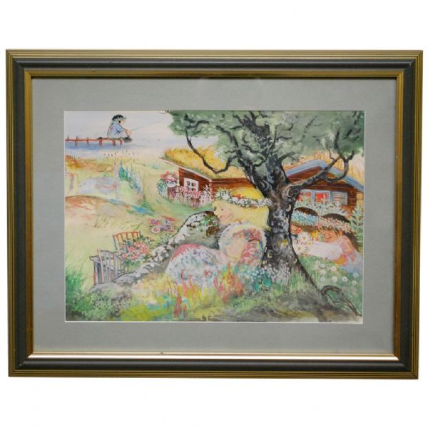 Fantasimotiv i skogen med inslag av troll, stugor och kust.