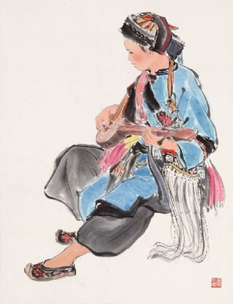 Mädchen einer nationalen Minderheit in Südchina beim Musizieren.