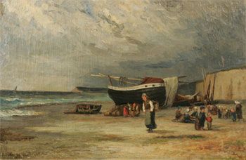 Strandvy med musselplockerskor