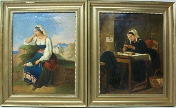 | A Greek lady with a parasol, and a housewife in a lace bonnet at a table | |