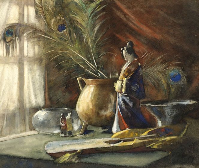 | Een stilleven van pauwenveren en een Oosters porseleinen beeldje | |