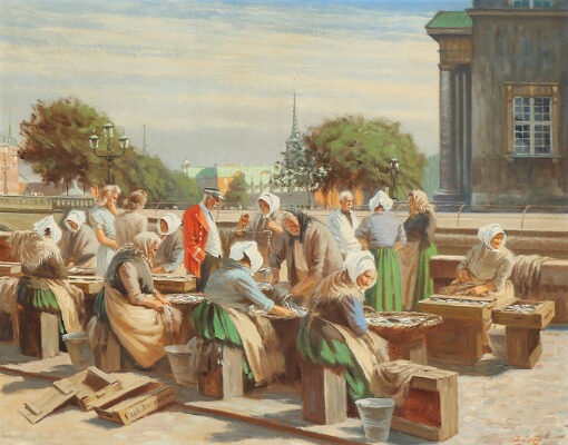 | A mailman and shoppers talking to the fishwives on Gammel Strand, Copenhagen | |