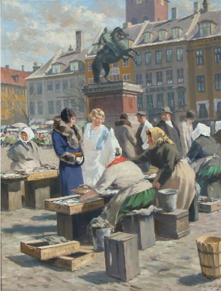 | Fishermens' wife selling fish at Højbro Square in Copenhagen. | |