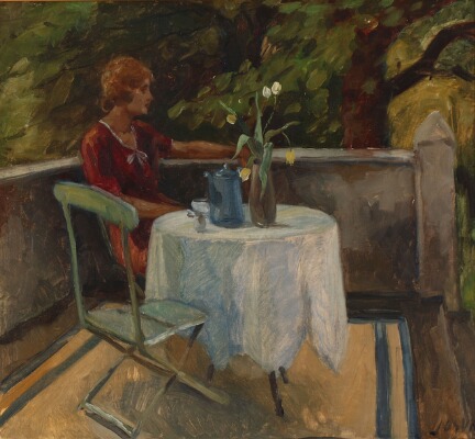 Garden view with a woman seated on a terrace