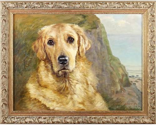 Portrait of a golden retriever by the sea