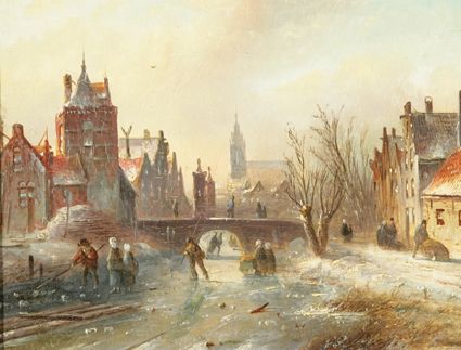 Paysage de ville en hiver avec patineurs sur une rivière gelée