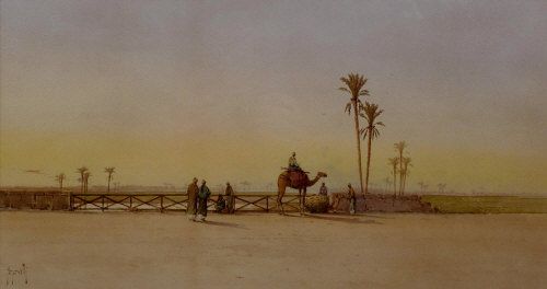 A CAMEL TRAIN IN THE DESERT; FIGURES AND CAMELS BY AN OASIS