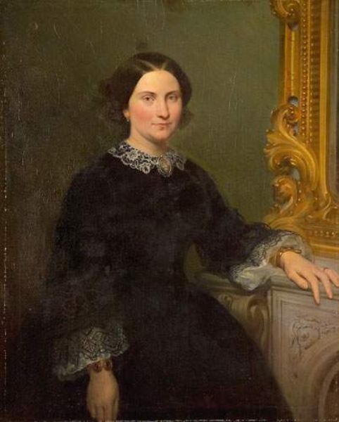 | Portrait de femme aux yeux bleus et cheveux noirs, accoudée à sa cheminée | |