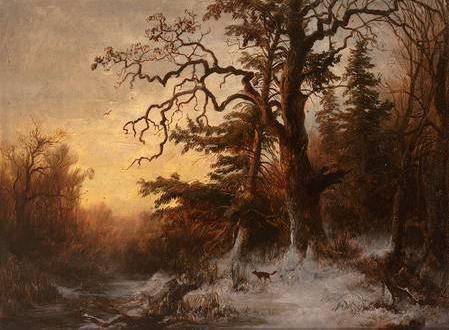 Winterliche Landschaft mit schnürendem Fuchs unter alten Bäumen