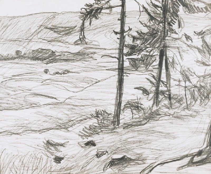 Pejzaż podgórski z samotnymi świerkami