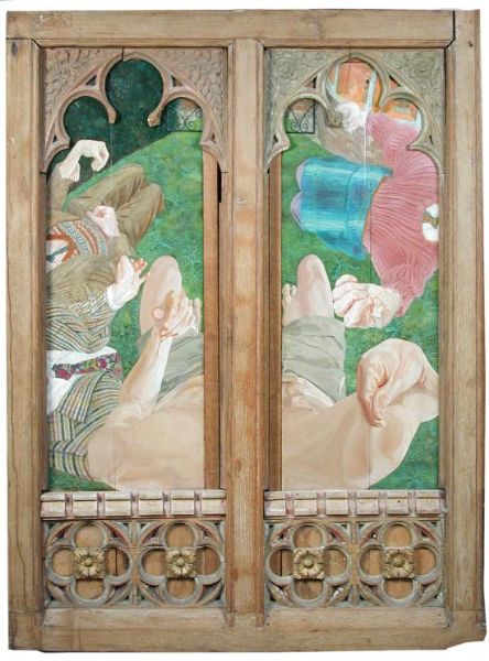 | A pair of painted Gothic oak screens, painted in reserves with figures from an elevated perspective | |
