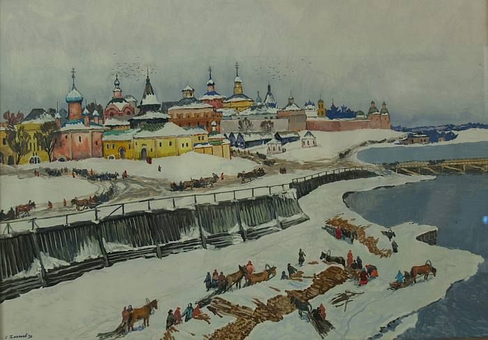 Stadt in winterliche Küstenlandschaft. Vielfigurig mit bunten Häusern und Pferdeschlitten