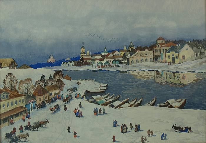 Winterliche Flußlandschaft mit Booten. Vielfigurig mit Häusern und Pferdeschlitten
