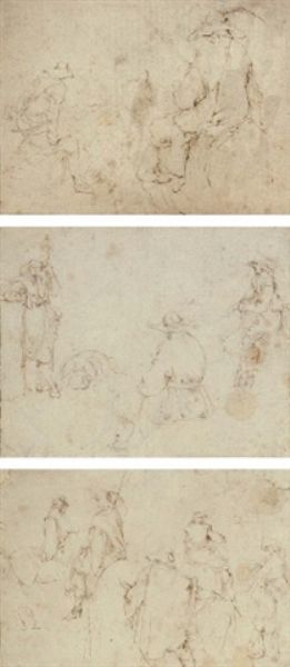 | A soldier with a pike, a seated figure and a horseman; Three horsemen and a peasant driving a cow, another to the right; and Two | |