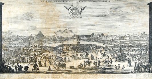 | La Perspective du Pont Neuf de Paris, a panoramic view, the bridge in the foreground thronging with coaches and horses, street | |