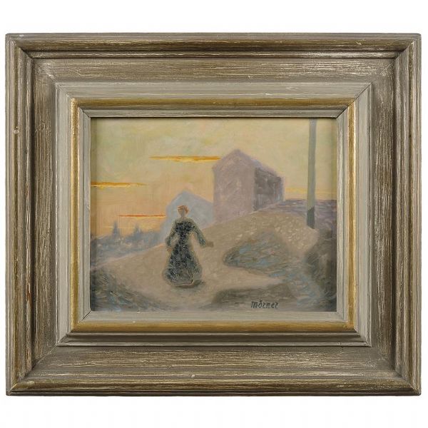 | I morgonljuset. Figur framför byggnader och himmel. A tergo titulerad | |
