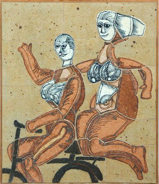 | A large wall relief of glazed stoneware tiles, partly glazed with reddish brown, brown, rose, white and blue glaze | |