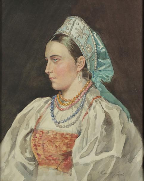 | Femme russe en tenue traditionnelle, portant un kokochnik. | |