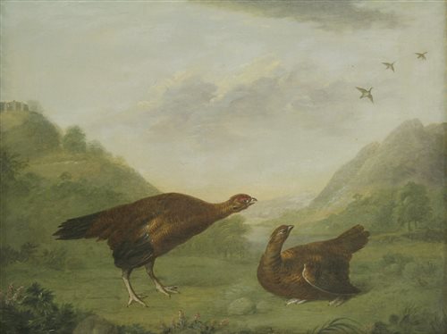 A PAIR OF GROUSE IN A MOUNTAINOUS LANDSCAPE