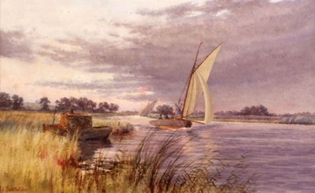 | White Sailed Yacht on the Norfolk Broads passing an Eel Catchers Boat, with further Boat and Windmill Beyond | |