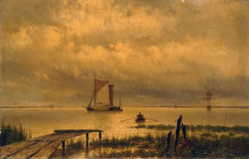 | A Quiet Dutch River Estuary, with rowing boats, sailing ships at anchor, moored sailing barges | |