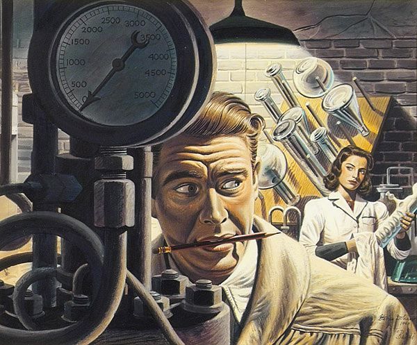 | Two scientists in laboratory, he apprehensive as she looks on. | |