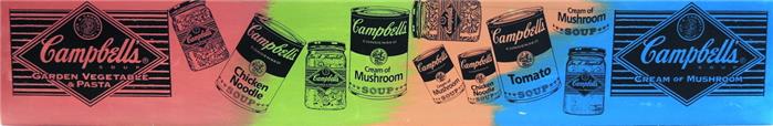 Pop Art. Campbell's Soup Dosen auf buntem Hintergrund