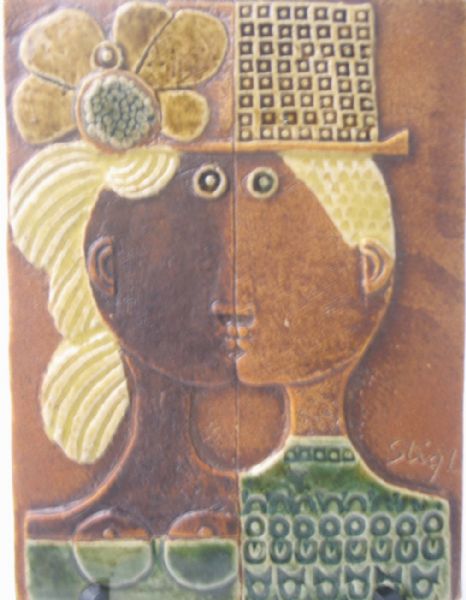 stengods, rektangulär, gul och grön mot brun botten, man och kvinna pussas