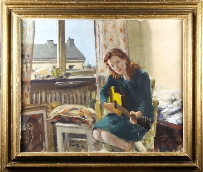 Interiör med gitarrspelande flicka