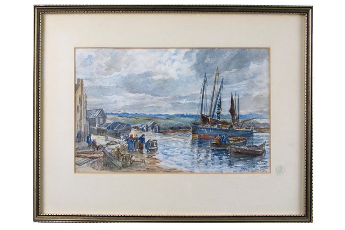 | Fishermen unloading their catch, shore scene near Bath, Cornwall, England | |