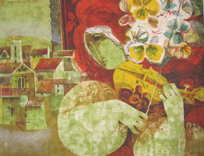 A stylized figure of woman playing violin