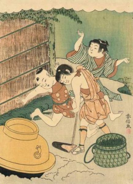 | Chuban tate-e, trois enfants jouant devant un panier. | |