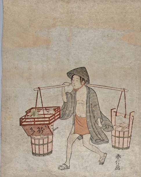 | Chuban tate-e, the seller of water walking and carrying two wooden seals hanging from a stick on his right shoulder. | |