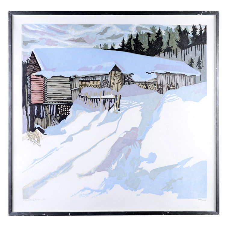 Ladugårdsbyggnad med snötäcke i skogslandskap