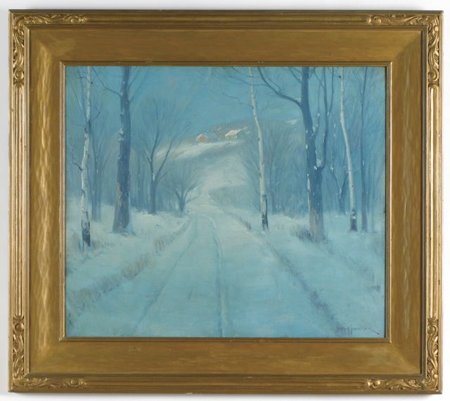 | Winter landscape, the snowy field having houses on hillside, predominantly soft blue field | |