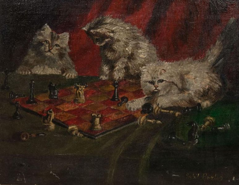 THREE CATS PLAYING CHESS
