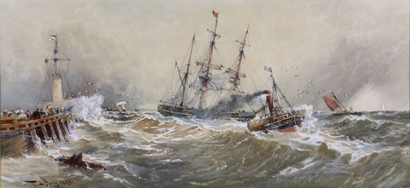 boats and paddle steamer in choppy seas off a crowded harbour arm