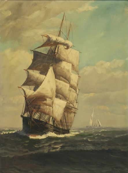 An American full-rigged ship and a sloop under sail.