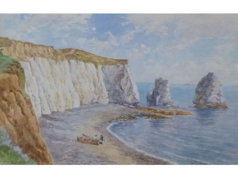 Figures on a beach with calk cliffs, probably Isle of Wight