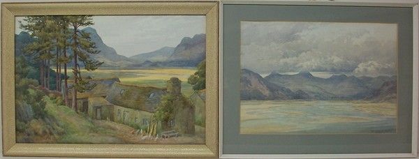 | a highland scene with water to the fore and mountains to the background, and a crofters cottage in a mountain scene | |