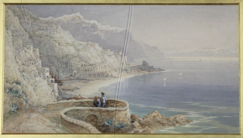 view of an Italian coastal scene with figures in a foreground and a distant hillside town