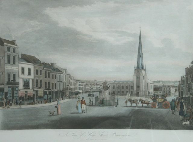 A view of High Street, Birmingham, coaches waiting for trade and gentry promenading