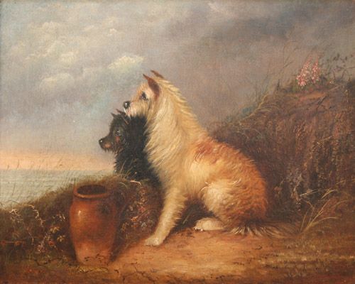 Two Terriers beside a Terracotta Jug within a Landscape
