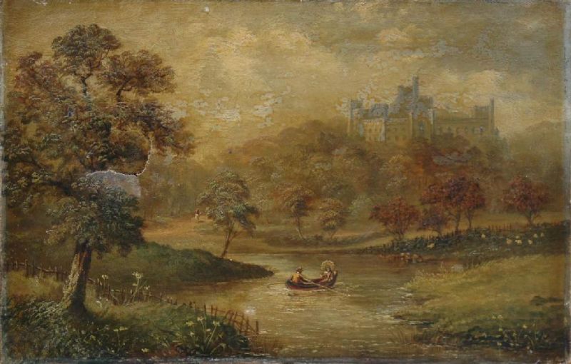 Figures in a rowing boat below Arundel Castle, Sussex